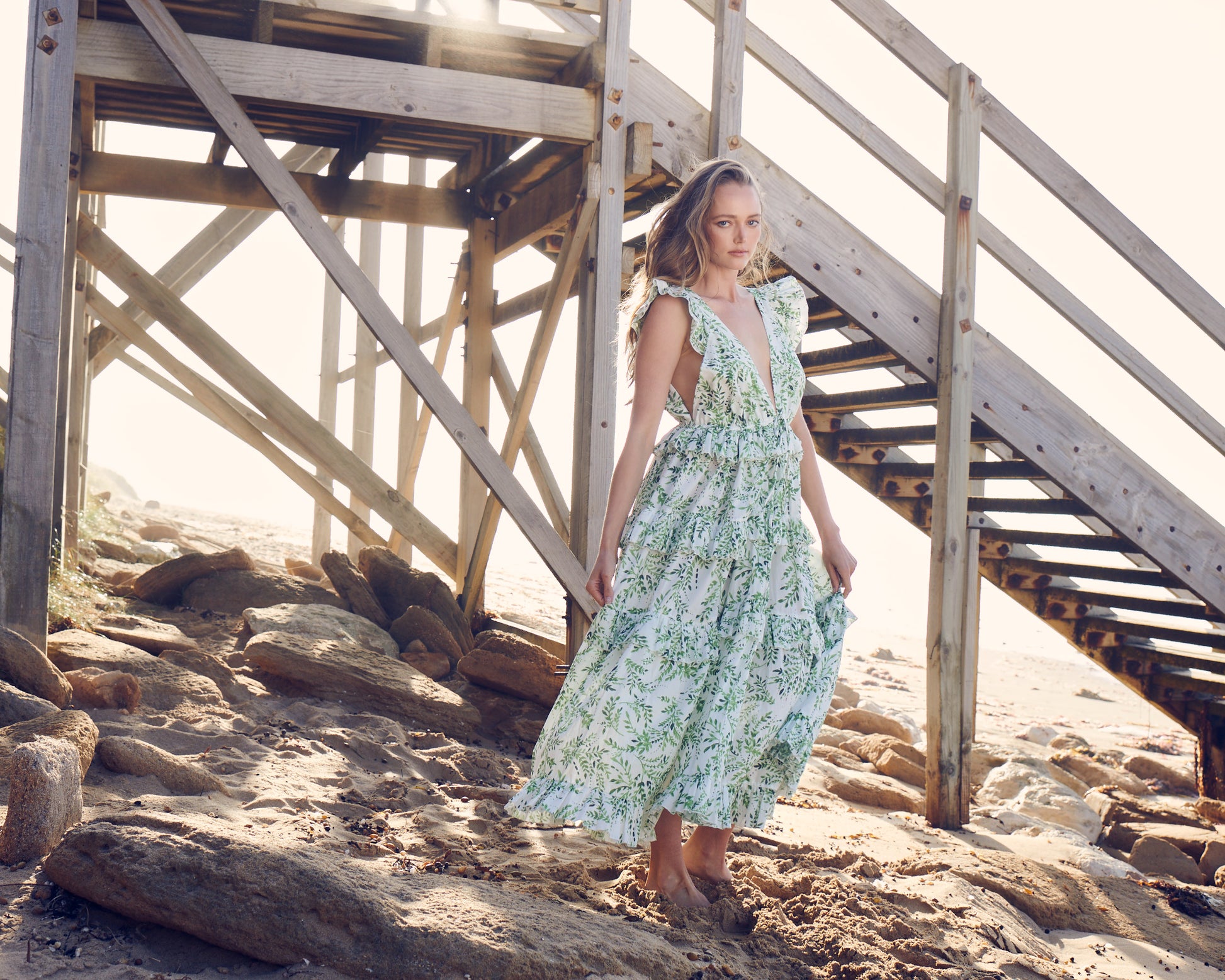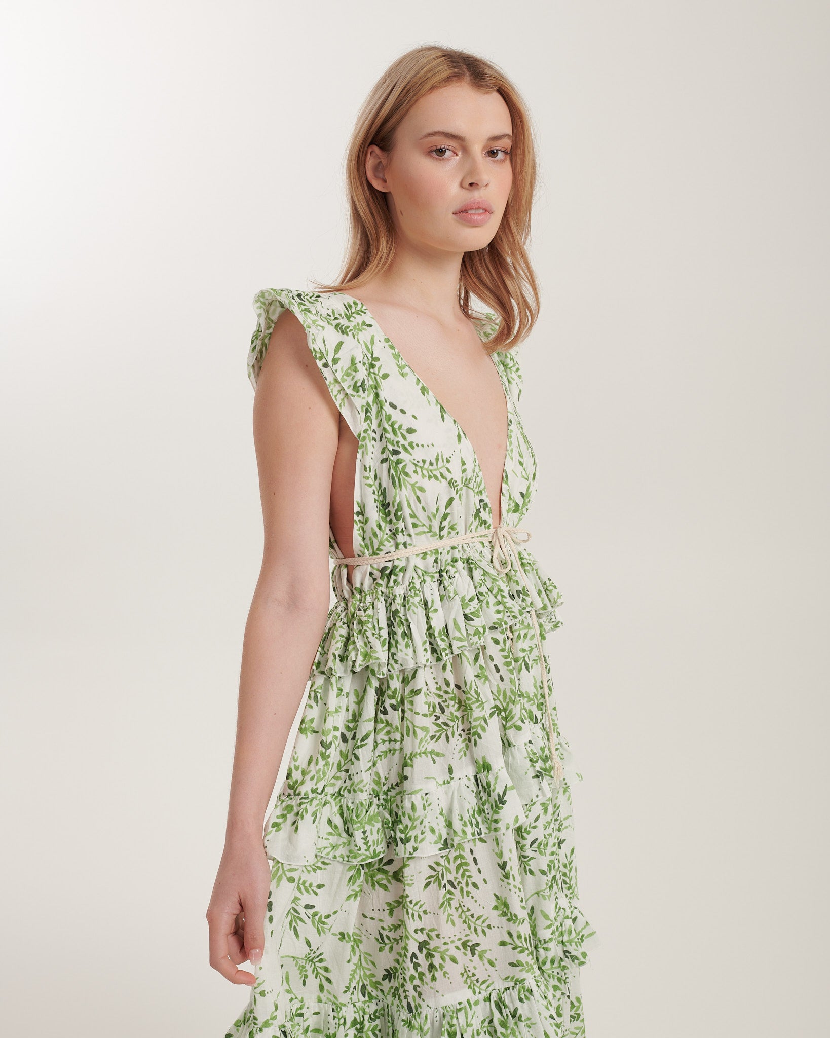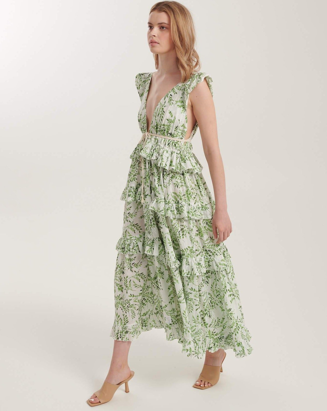 This ultra-feminine cotton maxi dress with tropics inspired print features a voluminous skirt, cascading ruffles and feminine ruffle sleeves.