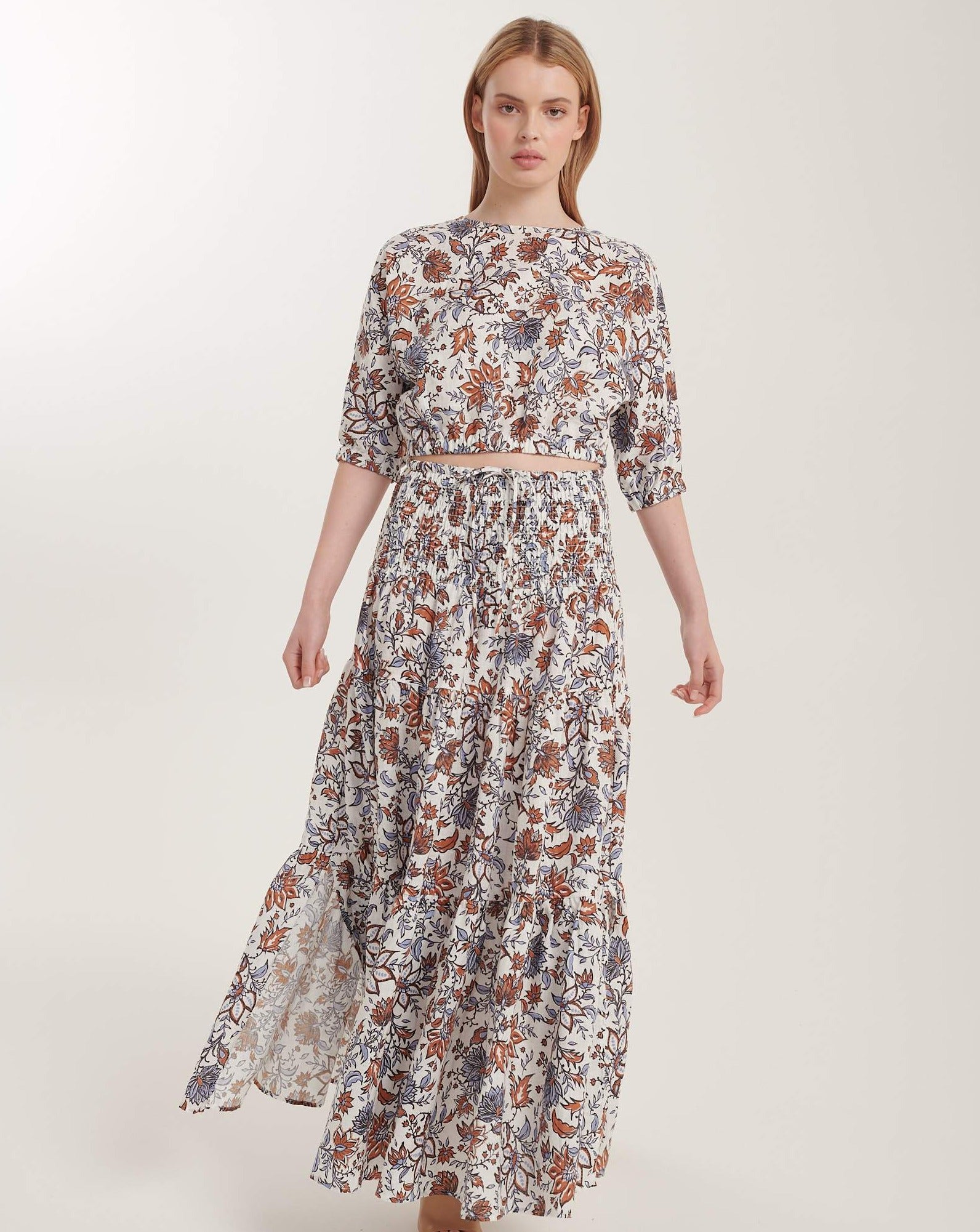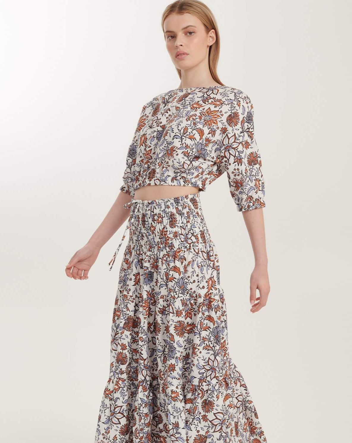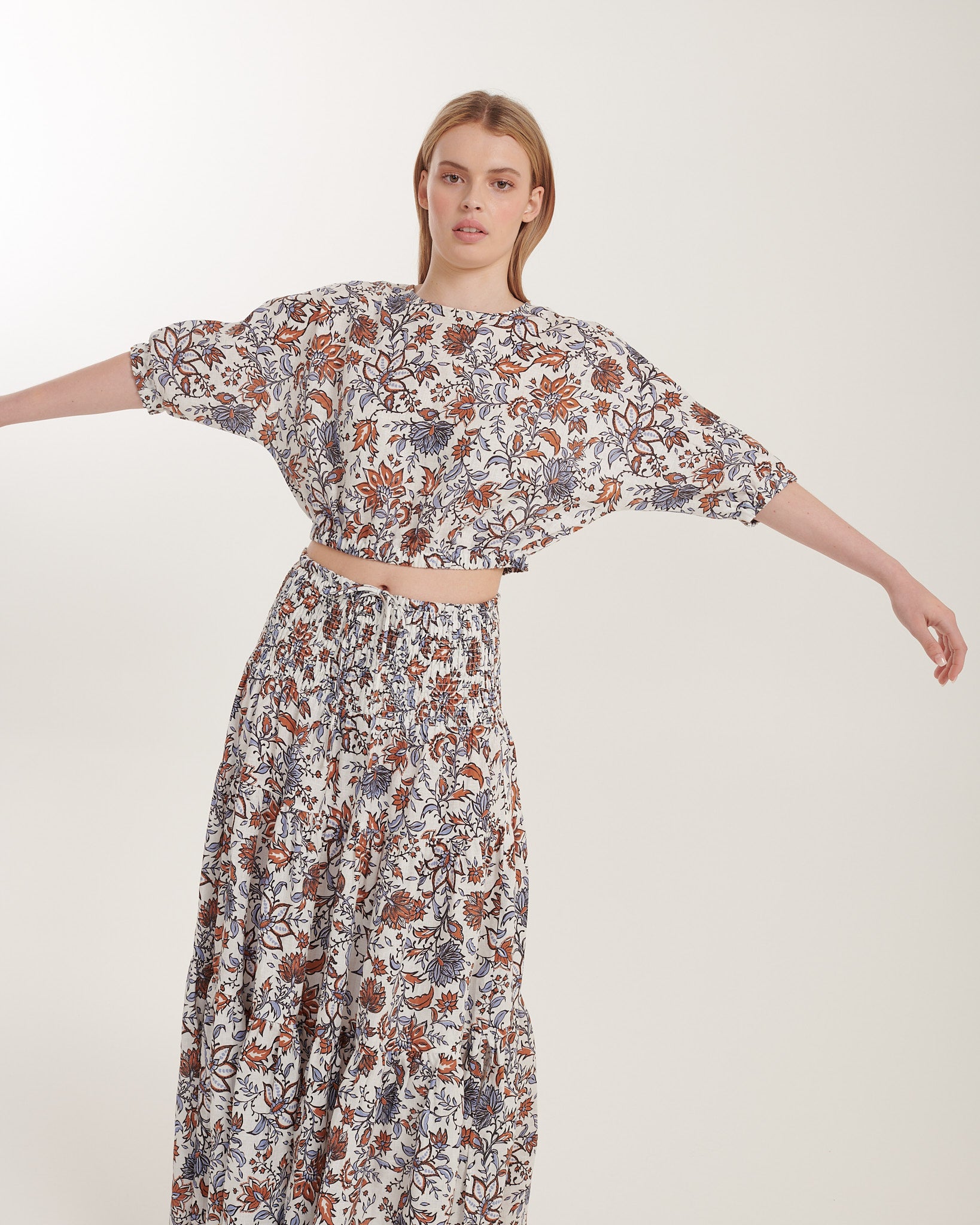 Made in an airy soft linen, this floral top has a relaxed cut with elasticated cuffs and around the cropped hem. Complete the set with the matching skirt from this season CARAVAN collection. Floral hand-painted print is exclusive to OLI & KUBO.