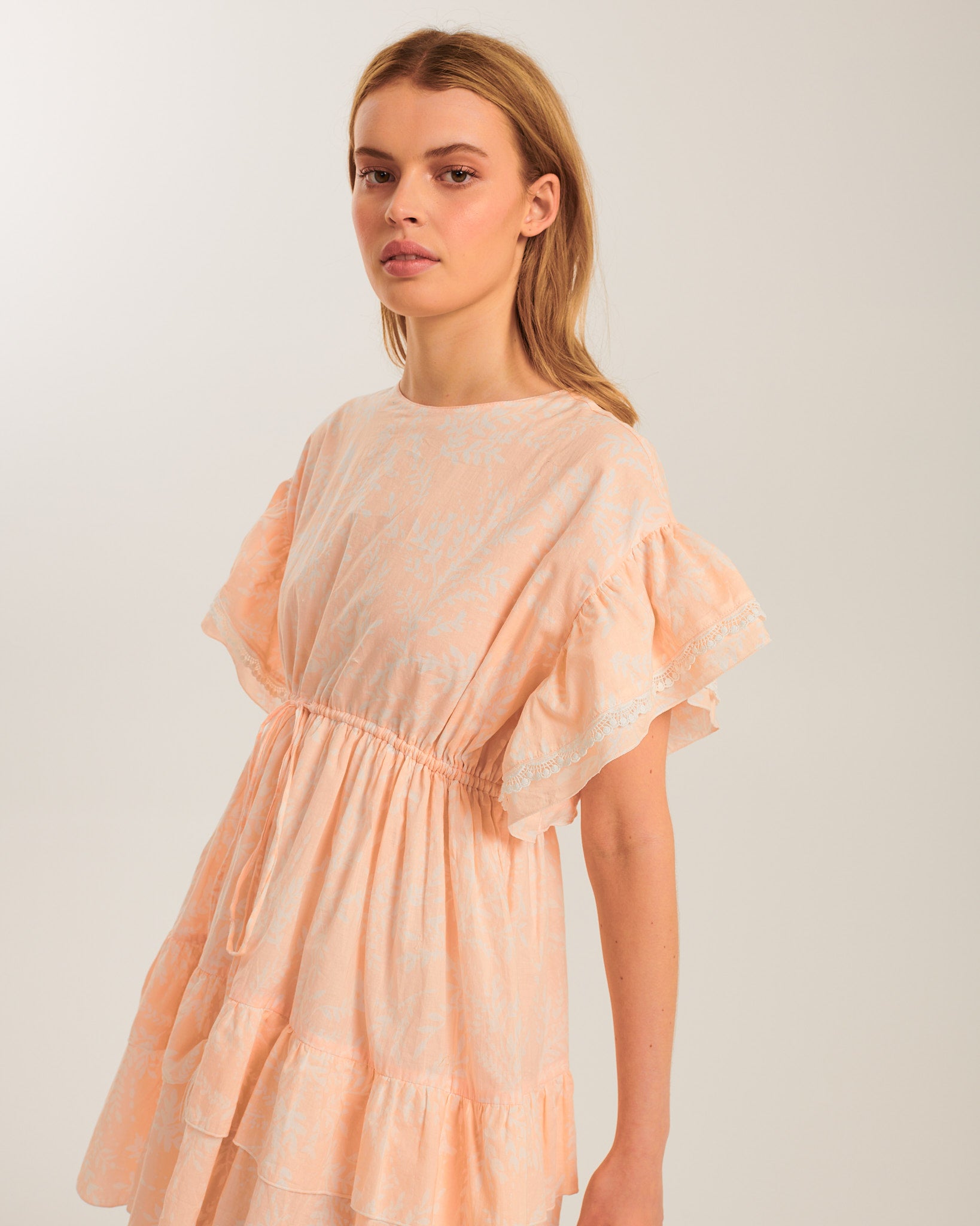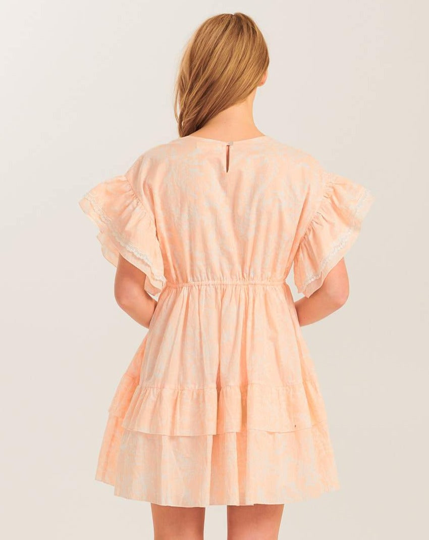 So sweet and flirty. This smock dress features relaxed silhouette, adjustable drawstring and playful tassel. Beautiful oversized ruffled sleeves with crochet trim and timeless soft floral fabric.Whether you live the beach lifestyle year-round or dream of making the great escape, our Meadows collection is full of our most effortlessly ethereal styles under the sun. Also available in matching Mommy & Me girls dresses.